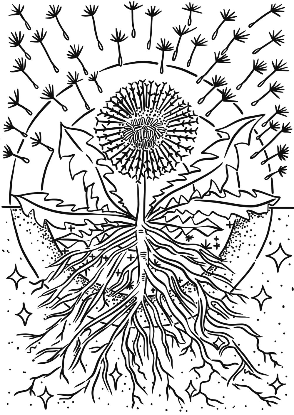 Community economy based on dandelions, drawing by Sarina Mantle, 2024