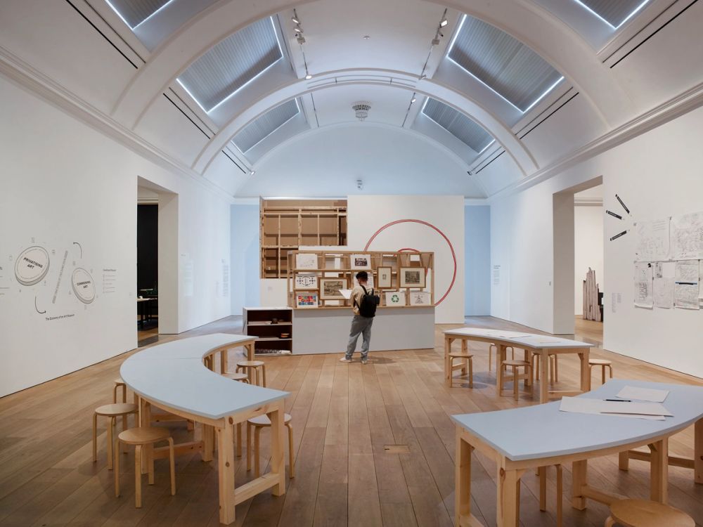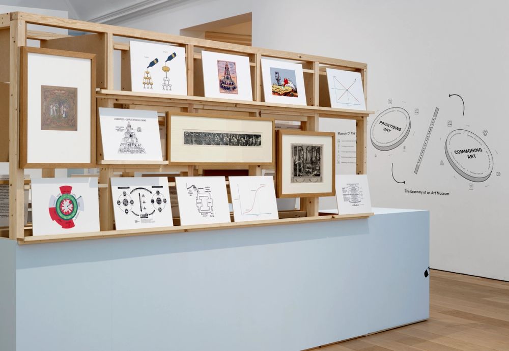 The Redrawing Room uses the middle gallery and consists of economic diagrams and images that have shaped our views and expectations on economy, alongside new diagrams that have been developed with team members from the Whitworth, drawing economies that are familiar and everyday to us.
