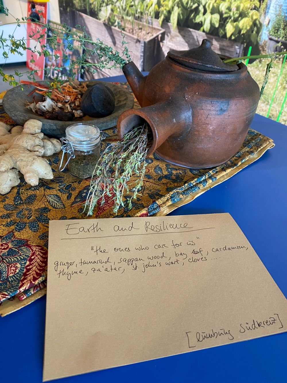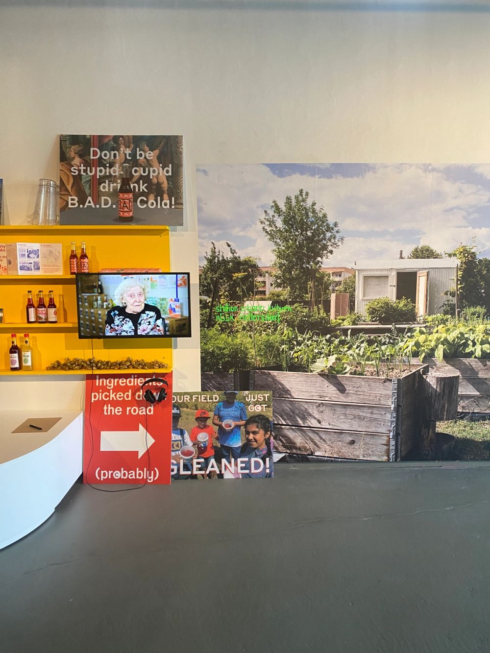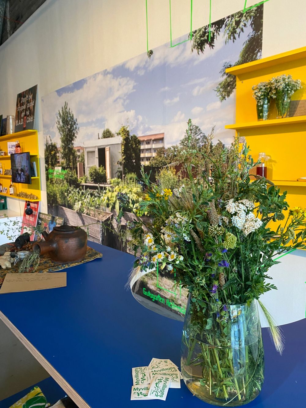 Installation shot, drinks table and a wall size photo of Gutsgarten Hellersdorf in Berlin