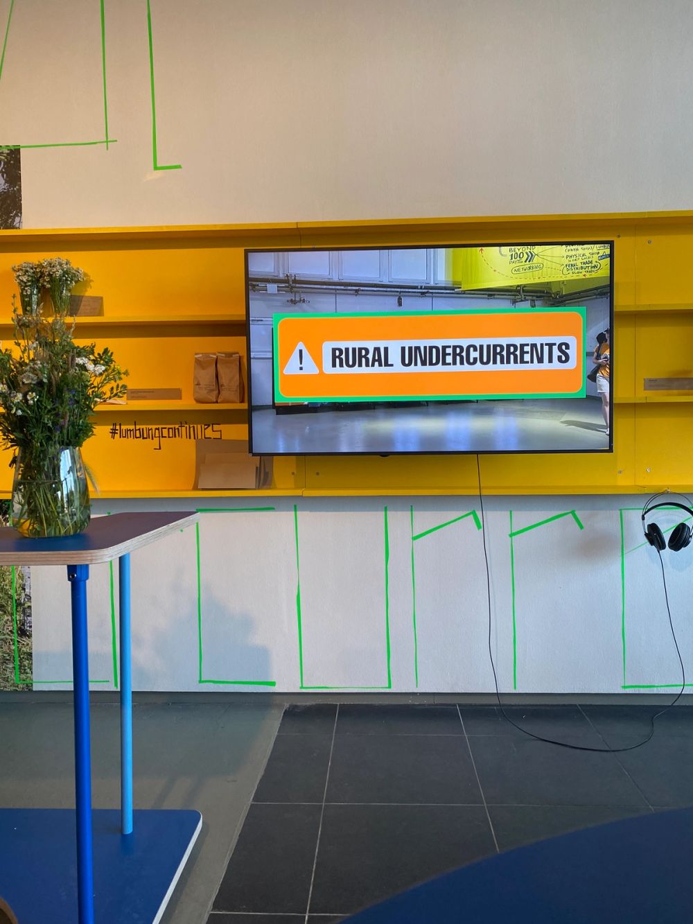 Installation shot, with drinks shelf and 'Kassel's Rural Undercurrents' film