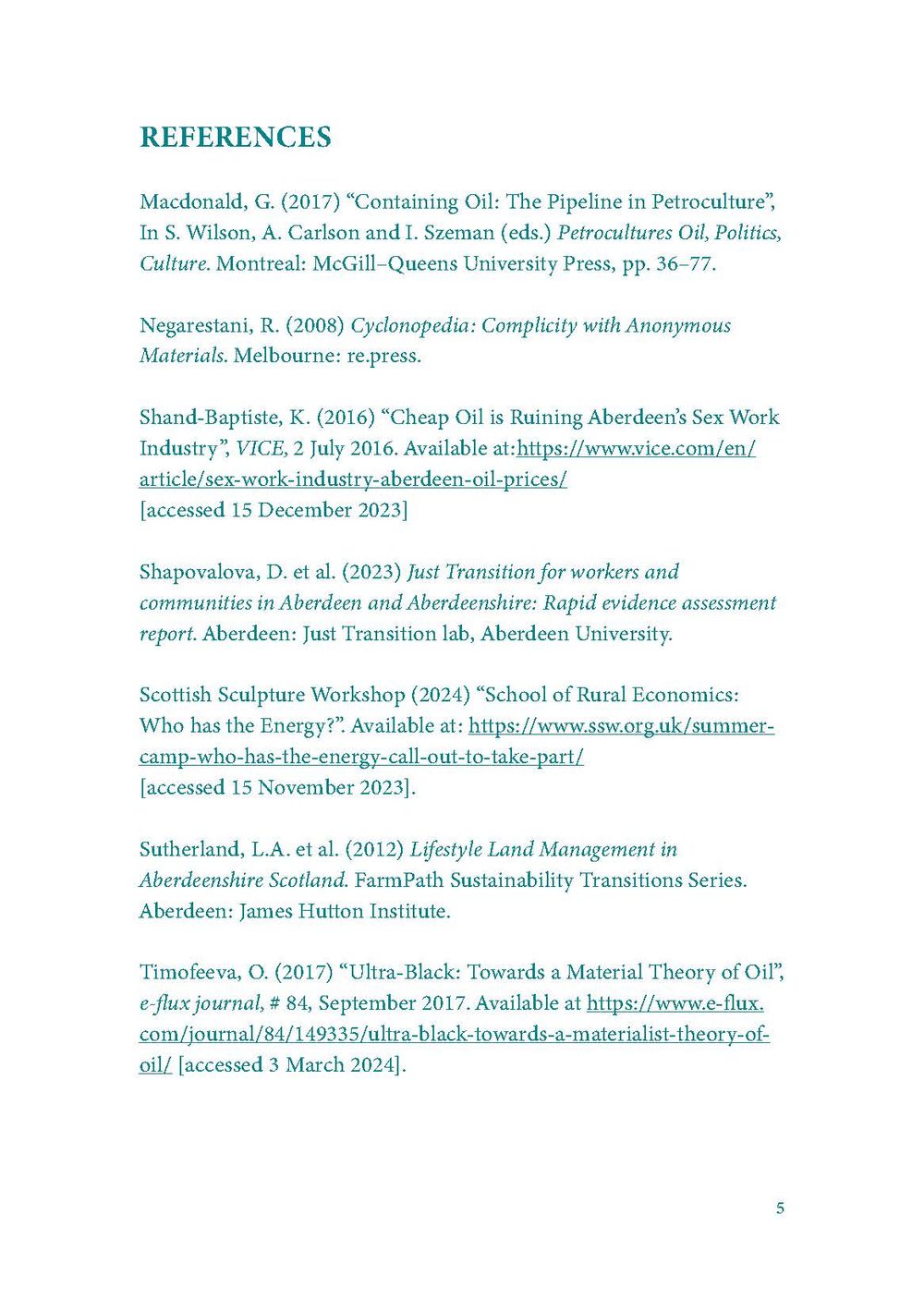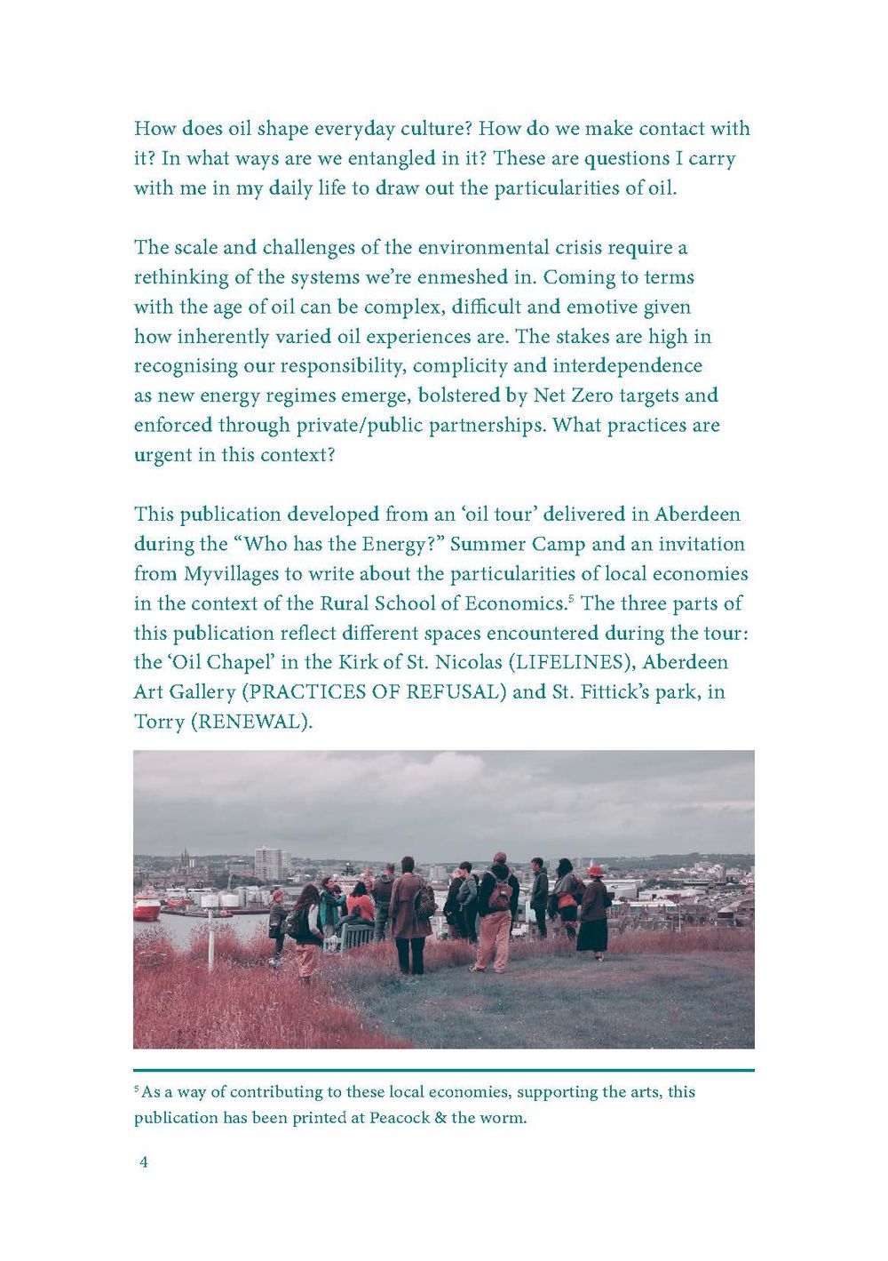 This publication has developed from ‘Oil as far as the eye can see – Energy regimes in the everyday’ a tour curated and guided by Rachel Grant that took place across Aberdeen, as part of Myvillages’ Rural School of Economics Summer Camp Who Has the Energy at Scottish Sculpture Workshop in Lumsden in July 2023.