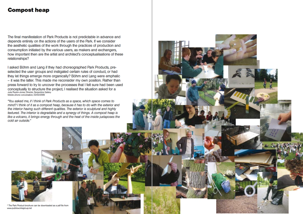 Park Products, devised together with Andreas Lang, was a two-phased project to make connections between different social, cultural, and material resources in and around Kensington Gardens, a Royal Park, and to extend the concept and realm of cultural production and distribution of the Serpentine