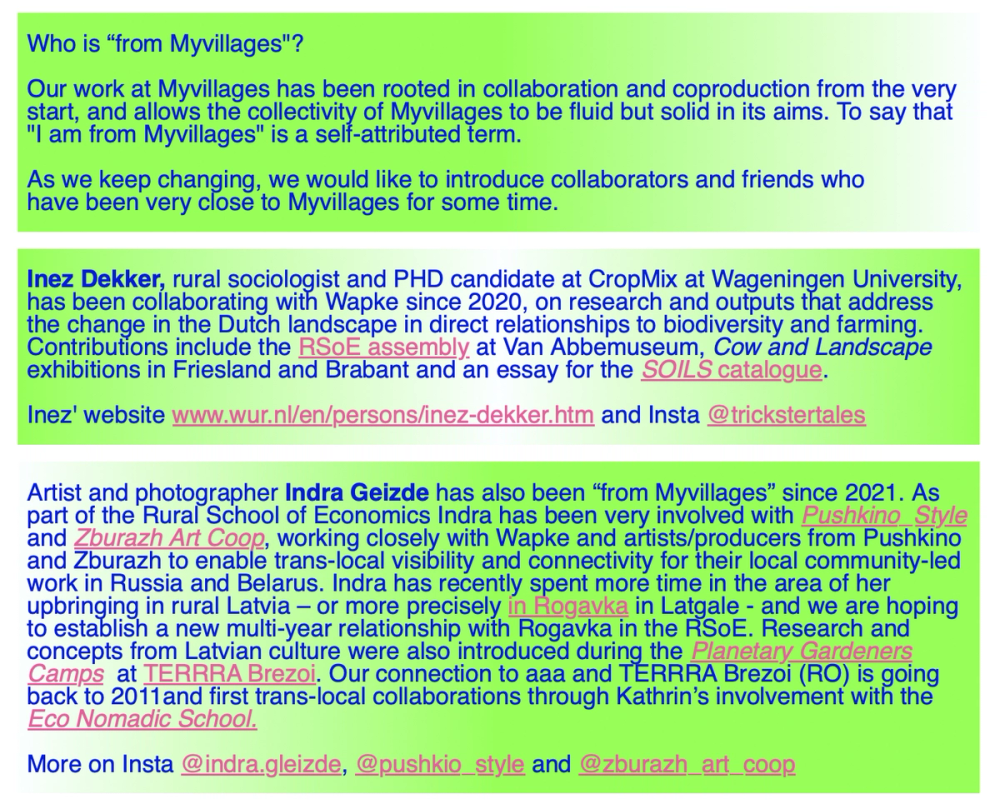 The Rural School of Economics by Myvillages is de-centralised, self-organised, multi-lingual, and nomadic. It exists as a multi-local and international network of geographically distant rural communities.