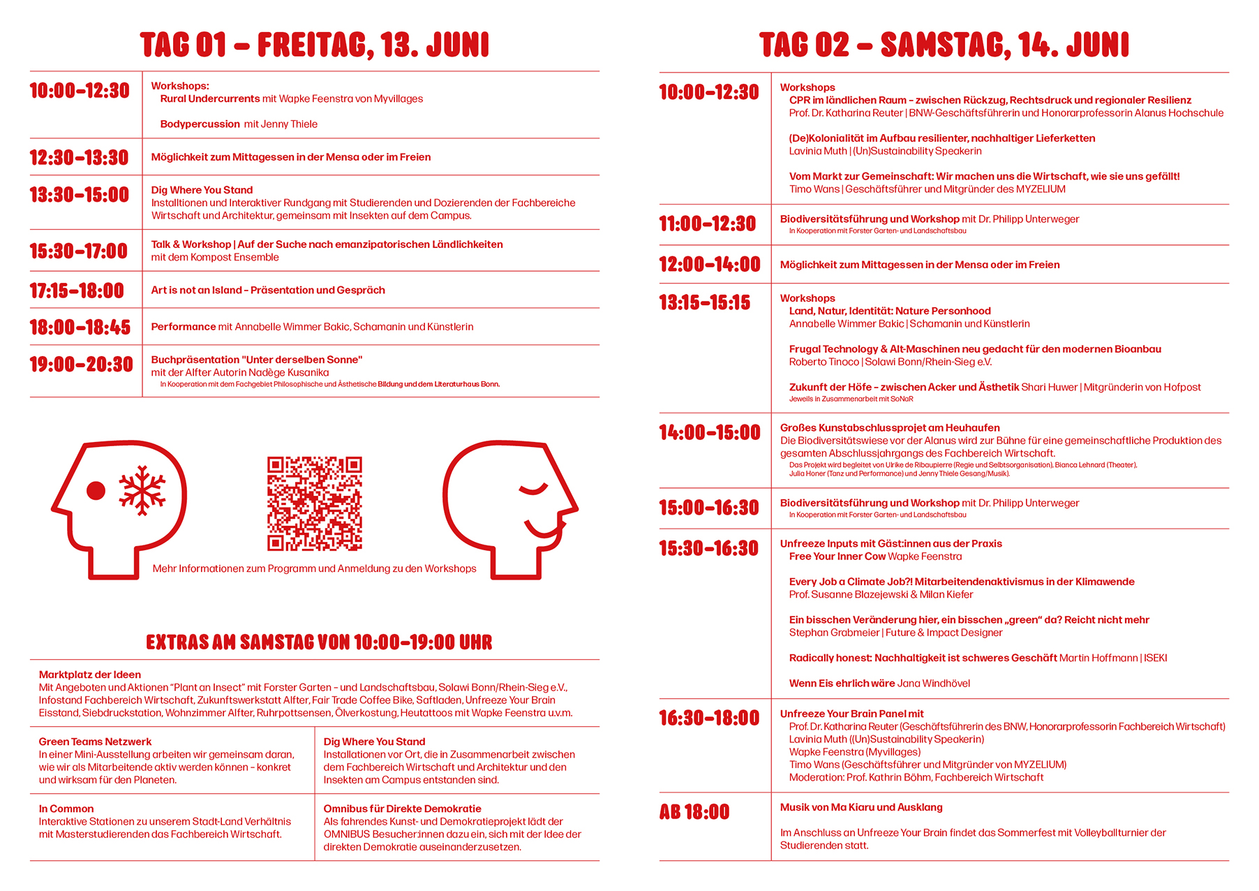 Contributors: Prof. Dr Susanne Blazejewski, Wapke Feenstra, Alina Gombert, Stephan Grabmeier, Shari Huwer, Milan Kiefer, Nadège Kusanika, Lavinia Muth, Prof. Dr Katharina Reuter, Jenny Thiele, Roberto Tinoco, Dr Philip Unterweger, Timo Wans, Teresa Weißert, Jana Windhöwel, Annabelle Wimmer, Prof Willem-Jan Beeren, Cindy Flückiger, Julia Honer, Anne von Hoyningen-Huene, Inox Kapell, Bianca Lenhard, Alessandro De Matteis, Ulrike de Ribaupierre, Jenny Thiele, Artepreneur, Bundeskunsthalle Bonn, Bund Nachhaltige Wirtschaft e. V. (BNW), Foster Garten- und Landschaftsbau, Myvillages, SoNar, UNO INO eG, Department of Architecture, Green Teams, Kompost Ensemble, Literaturhaus Bonn, Myzelium, PhASe, SoLaWi Bonn/Rhein-Sieg e. V., Fair Trade.